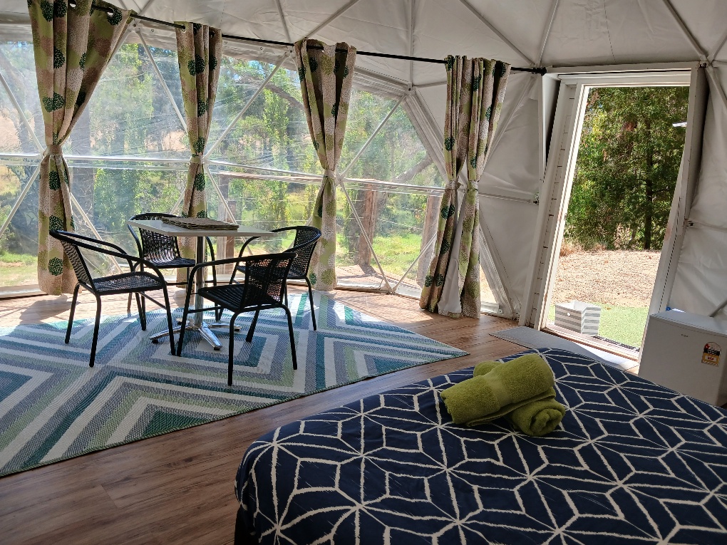 Dome 120 has a Queen Sized bed and 2 King Singles. It is perfect for that getaway back to nature. Leave the devices behind and enjoy the peaceful natural environment. Listen to the birds, go for a walk along the River, bring your bikes and about work. Whether you want to just be on your own, a couple or a family of 4, you will love the serenity.